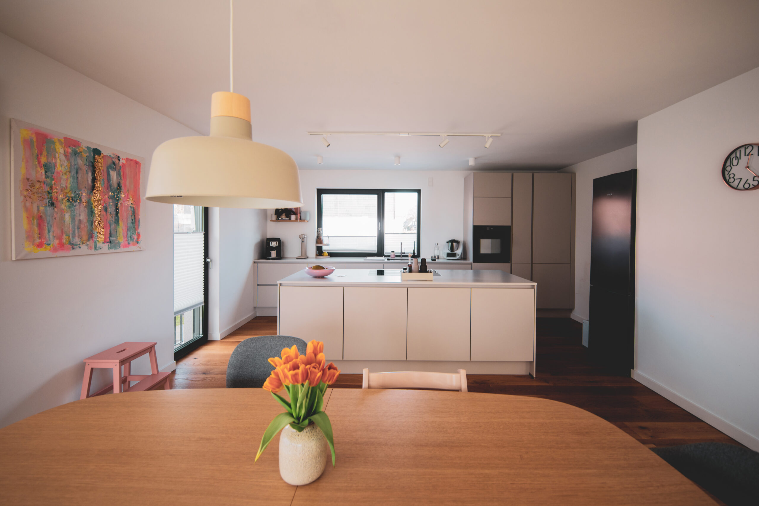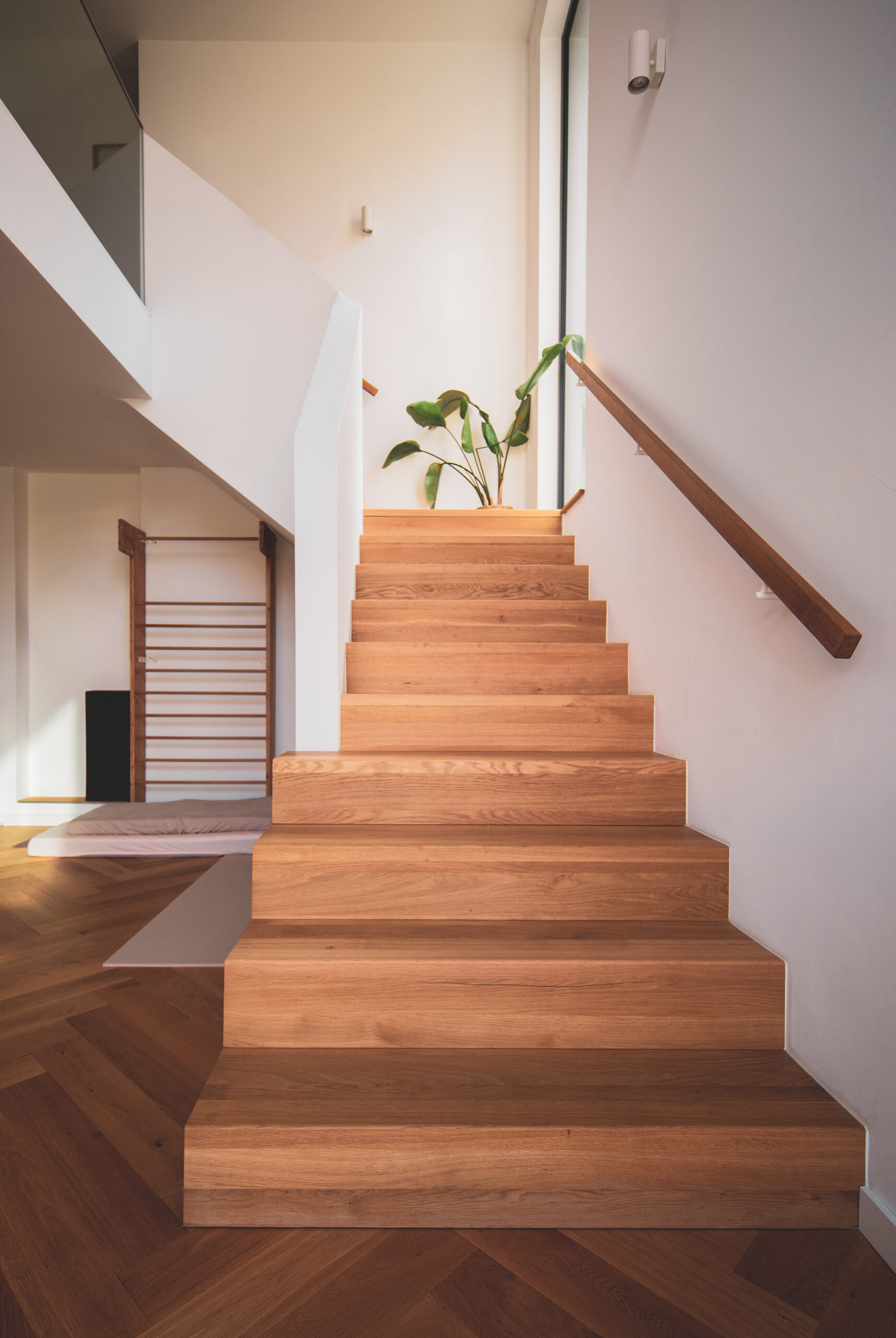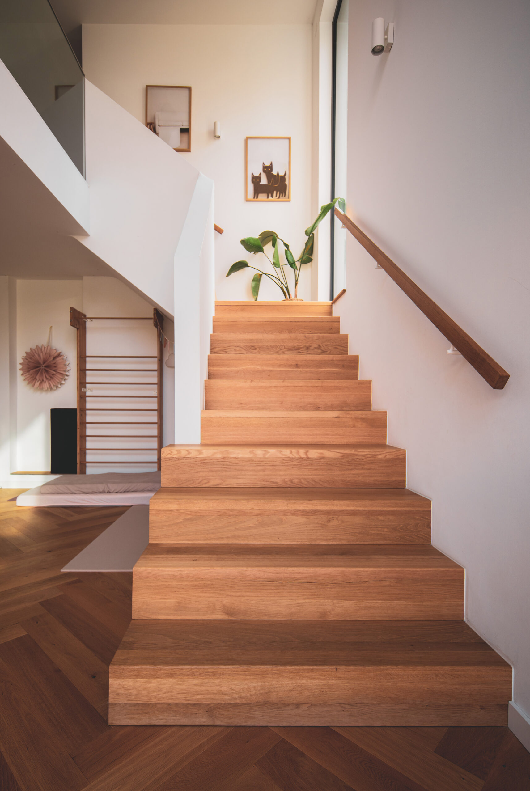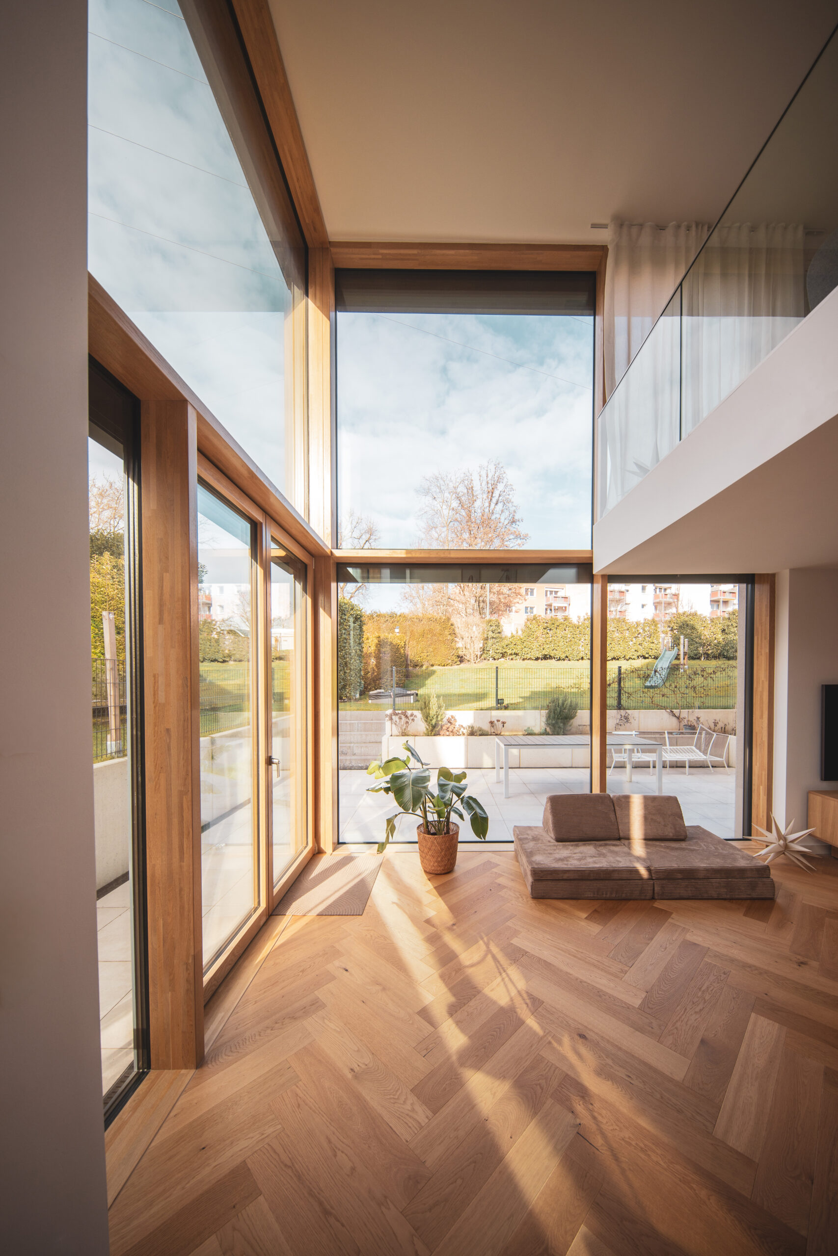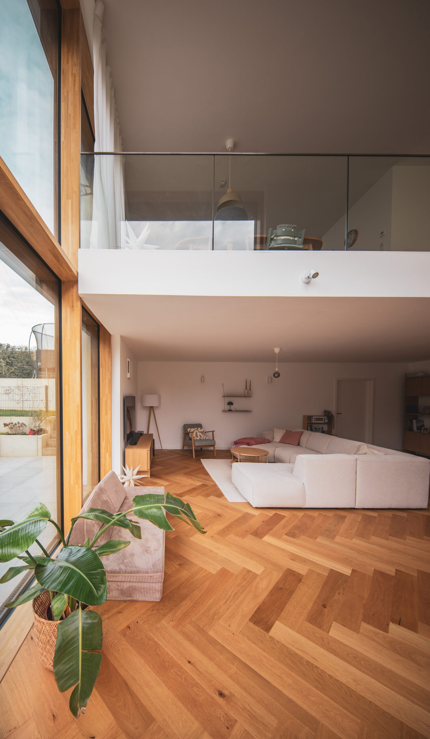 Im Inneren entstehen fließende Übergänge: Das Erdgeschoss des Bestands öffnet sich zu einer großzügigen, zweigeschossigen Galerie mit markanter Eckverglasung, die das Unter- und Erdgeschoss lichtdurchflutet miteinander verbindet. Abgerundet wird das Raumkonzept durch die Erweiterung des Dachgeschosses, das mit einem neuen Balkon zusätzliche Lebensqualität schafft.