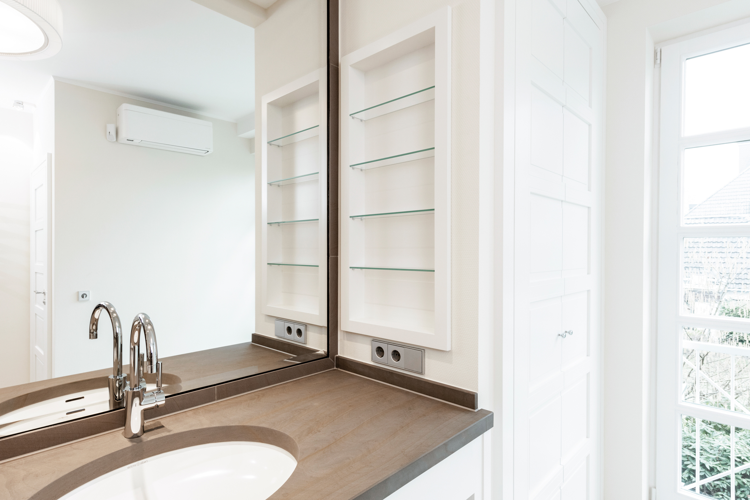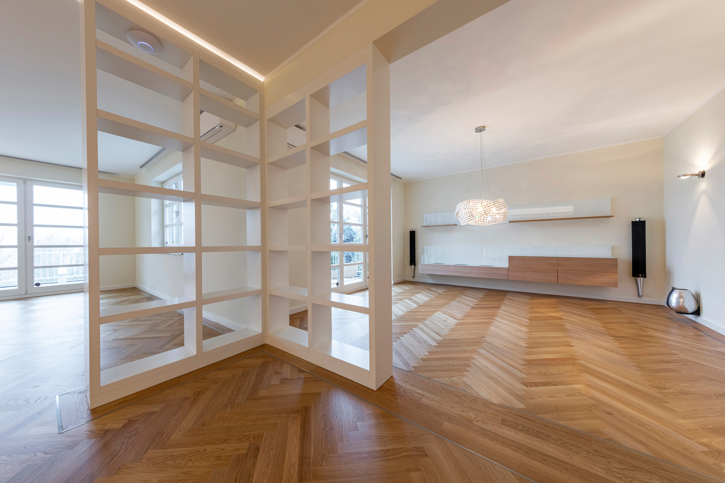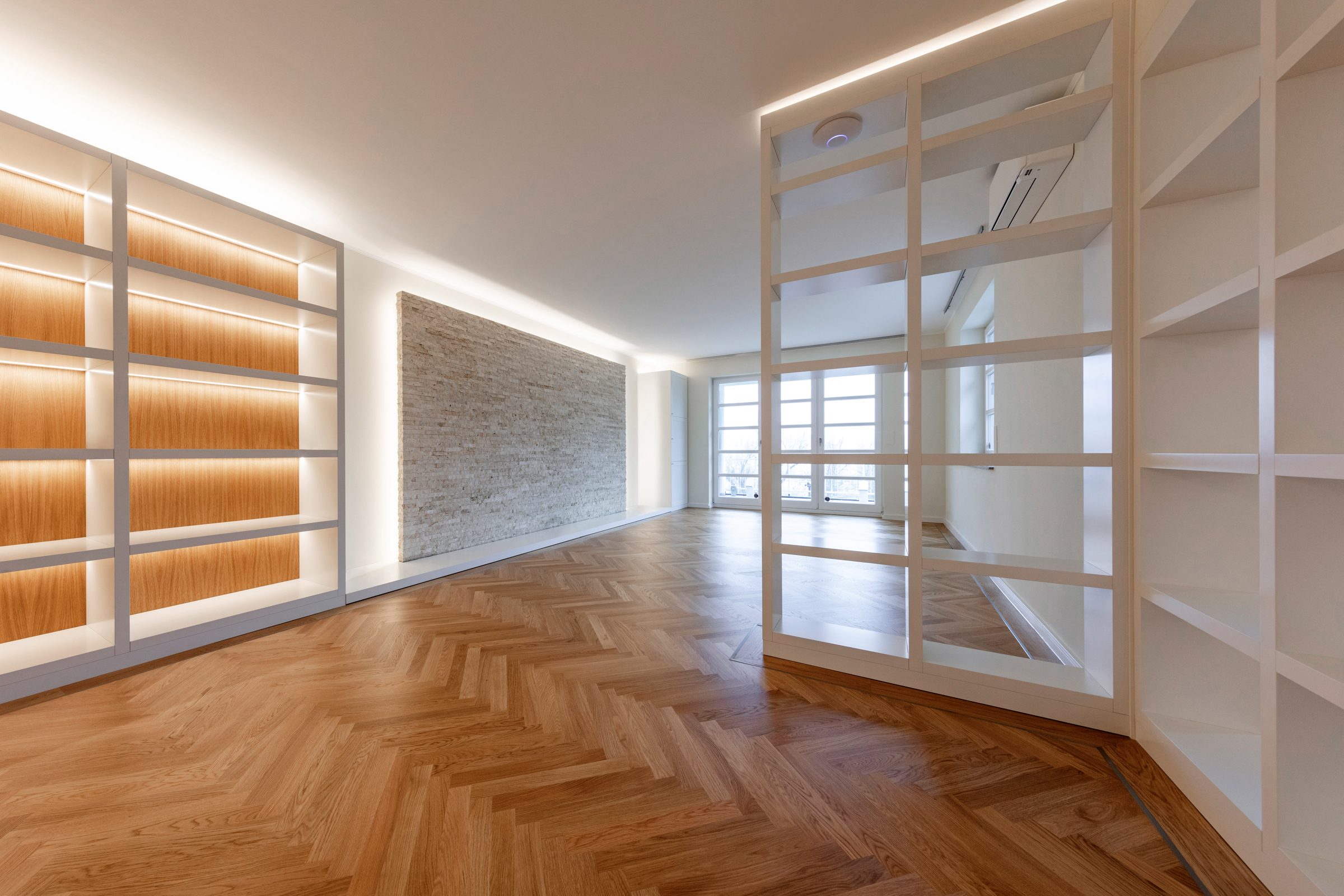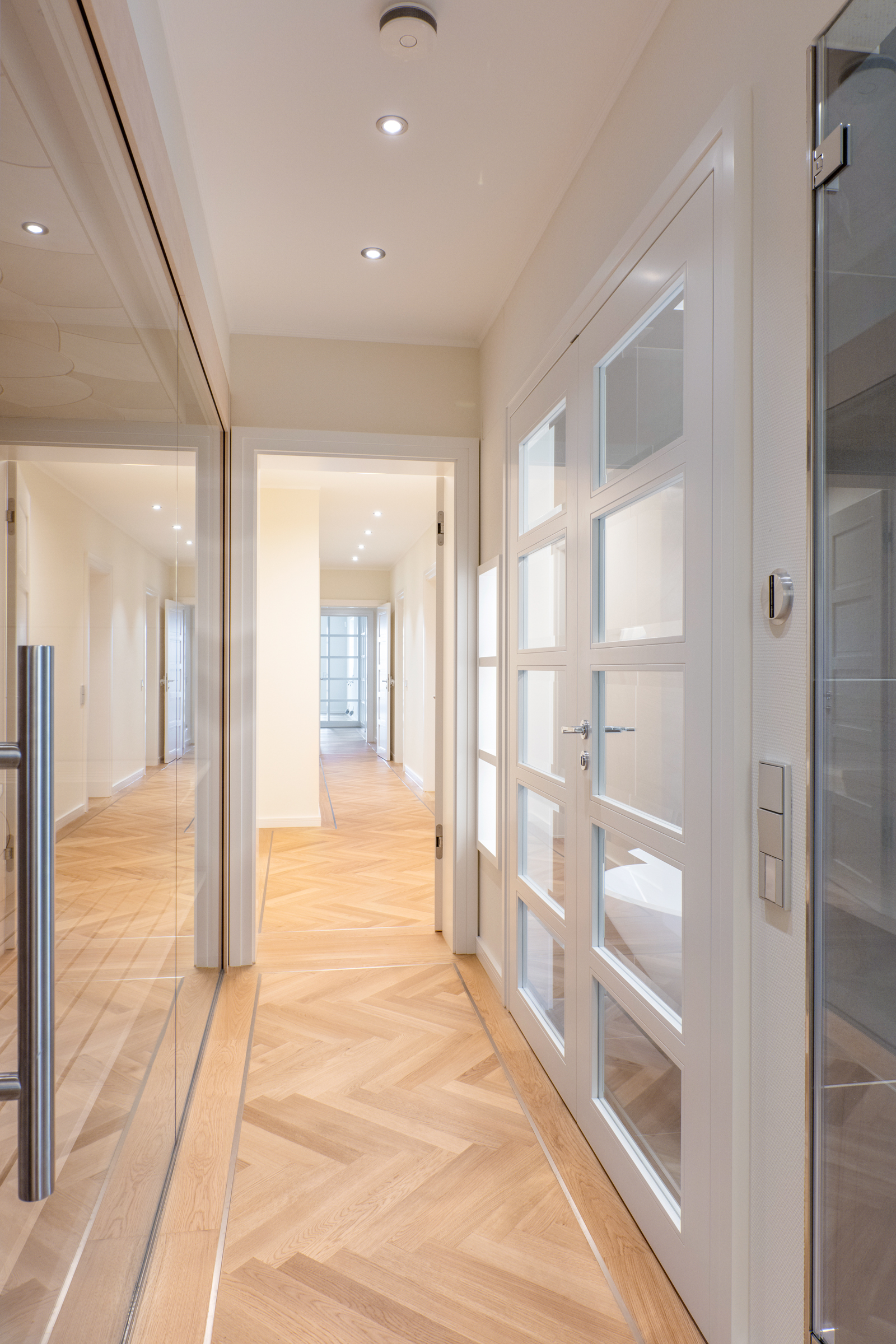 Durch die Zusammenlegung zweier Wohneinheiten und einen statischen Durchbruch entstand in Düsseldorf-Benrath eine großzügige, neu aufgeteilte Eigentumswohnung. Alle Oberflächen wurden mit Fokus auf edle Haptik und eine zeitlose Ästhetik hochwertig neugestaltet. Die Modernisierung umfasste die komplette Erneuerung der Elektro- und Sanitärinstallationen sowie die Integration einer diskreten Vollklimatisierung für maximalen Komfort. Maßgefertigte Einbaumöbel nutzen den Raum optimal aus und verleihen dem Interior Design eine individuelle, skulpturale Note. Das Ergebnis ist ein exklusives Refugium, das moderne Technik und handwerkliche Präzision perfekt vereint.