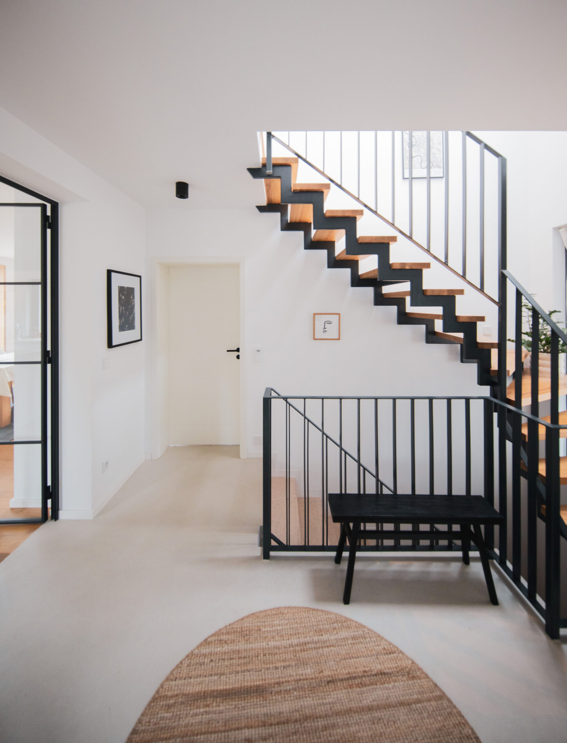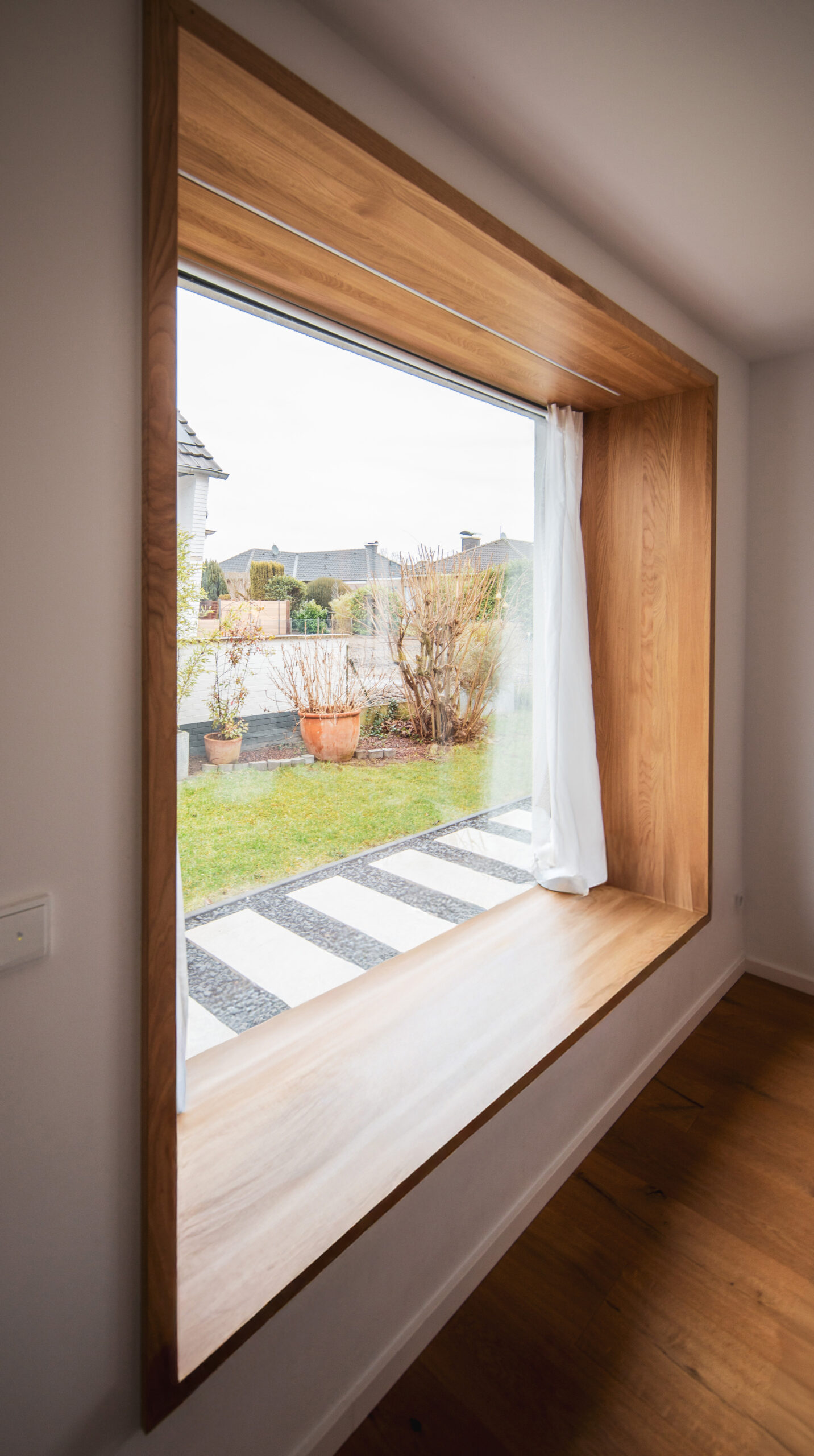 Im Zuge einer umfassenden Kernsanierung wurde dieses Einfamilienhaus für eine vierköpfige Familie umgebaut und durch einen markanten, kubischen Anbau erweitert. Dieser Neubau ermöglicht nicht nur einen großzügigen, offenen Grundriss im Erdgeschoss, sondern schafft im Obergeschoss zudem Raum für zwei Kinderzimmer. Ein gezielt platziertes Sitzfenster erzeugt eine harmonische Verbindung zum Garten und lädt als Rückzugsort zum Verweilen ein. Im Innenraum bilden anthrazitfarbene Akzente einen spannenden Kontrast zu warmen Holztönen.