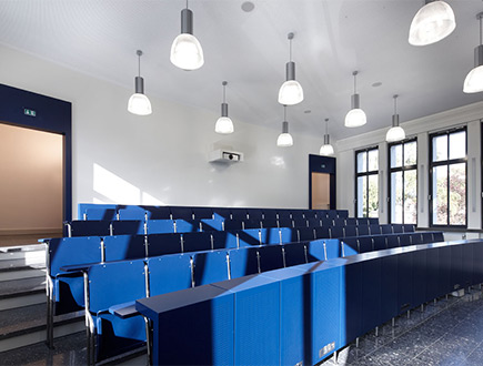 Dazu wurde die bestehende Bestuhlung vollständig überarbeitet und neue beleuchtungs- und Medientechnik installiert. Auch der Eingangsbereich und das Treppenhaus wurden neu gestaltet.